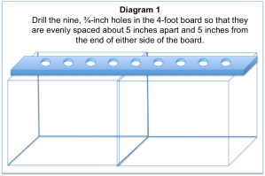 - Thin piece of plywood or piece of plastic or metal (4 ft long) with nine 3/4 in holes drilled in it about 5 inches apart and 5 inches from the end of either side of the board. (You can often find a piece of metal that has pre-drilled holes in it that will work just fine near the shelving part of your local hardware store.)