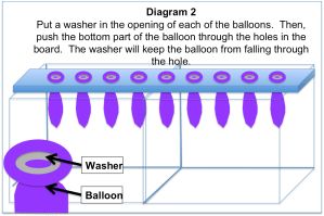 - Put the board with the balloons across the clear, plastic tub so that the balloons hang down into the tub.