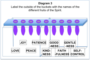 - “We know from Galatians 5:22 that the fruit that Jesus is talking about is love, joy, peace, patience, kindness, goodness, faithfulness, gentleness and self-control.” (If the kids are not familiar with the fruit of the Spirit, you might want to take a moment to describe each one for them.)