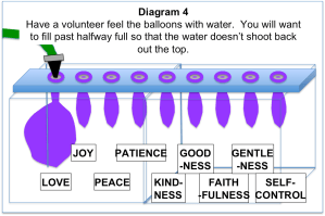 - “We produce fruit by filling the balloons with the water. This is like the Holy Spirit flowing through us (the nozzle) to do the good works that the fruit represents.” (Allow your volunteer to begin to fill one of the balloons. Turn off the nozzle when the balloon is full enough that the water doesn’t come shooting back out the top – over half-way.)