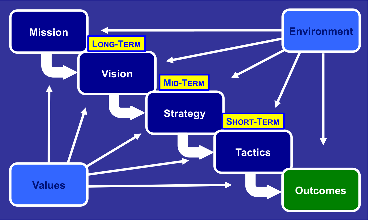 - “Moreover, the Environment is constantly changing and will force us to make adjustments in our Vision, Strategy, Tactics and even our Mission and Outcomes at times.”