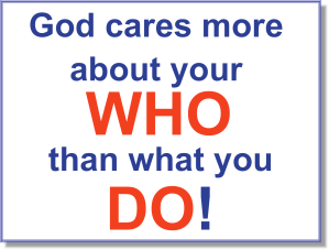 - “Now just because God cares about your WHO more than what you DO doesn’t mean that He doesn’t care at all about what you DO.” (Point to each volunteer as you mention their sign.)