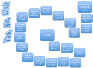 Peter says that God is attentive to (really pays attention to) our prayers, but sometimes we don’t get the answer we expect or want and sometimes we don’t get any answer at all. It’s helpful to know that God always answers prayer with one of three answers, Yes, No or Wait. When He says yes, we can move ahead. When He says no, we should take a step back and reconsider what we are asking. If God doesn’t want us to have it, it either isn’t good for us or doesn’t fit with His bigger plan. When God doesn’t seem to answer, He is most likely saying that we should wait. He wants to grant us our request, but it’s not time yet. This board game will illustrate principles of prayer.