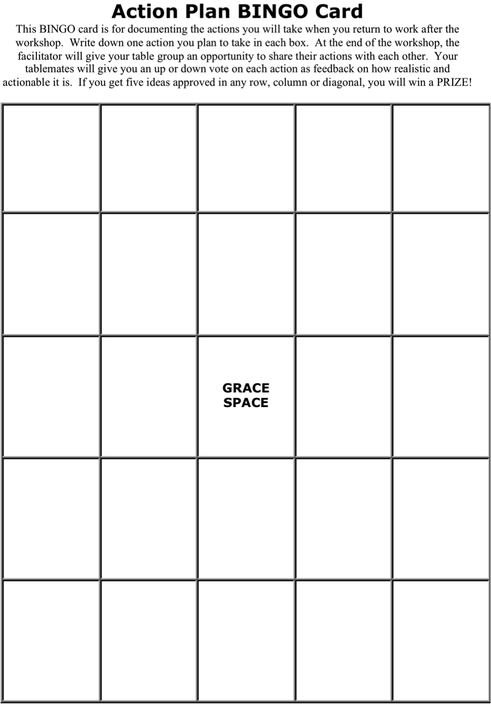 - “Rows, columns or diagonals with the Grace Space in them still count.” (Answer any questions about the game. Remind them to add action items periodically throughout the learning event. At the end of the event, reserve 30 minutes for them to follow the up-down voting process that you described. Award prizes for every BINGO that they make. I recommend saving prize-giving until after the complete review has been done, but you might encourage them to shout “BINGO!!!” whenever they get five in a row. NOTE: sometimes the same action item can count for multiple BINGOs. It might count horizontally, vertically and diagonally.)