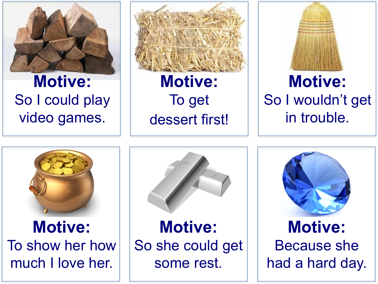- If the “Motive” has a picture of firewood, a bale of hay or a straw broom, the person has to “burn it” by putting it into the center of the group.
